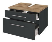 Erleben Sie den modernen Stil mit dem XORA Waschtischunterschrank DAVOS. Dieses stilvolle Möbelstück besticht durch seine trendige Farbgebung in Grau und Graphit, die Ihrem Badezimmer einen eleganten Look verleiht. Der Schrank ist aus hochwertiger Holznachbildung gefertigt und bietet dank der zwei Schubladen ausreichend Stauraum für Ihre Badutensilien. Die Schubladen sind mit einem Softclose-Mechanismus ausgestattet, der ein sanftes und leises Schliessen gewährleistet. Die Griffe aus Metall ergänzen das moderne Design perfekt und sorgen für eine angenehme Haptik. Der hängende Aufbau verleiht Ihrem Bad eine luftige und aufgeräumte Optik.