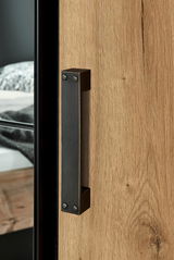 Der Z2 Drehtürenschrank 4trg. CORK vereint modernes Design mit funktionaler Eleganz. Die Korpus- und Fronttüren in Plankeneiche Nachbildung verleihen dem Schrank einen natürlichen Charme, während die graphitfarbenen Applikationen und Griffe einen stilvollen Kontrast schaffen. Mit vier Drehtüren und zwei graphitfarbenen Schubkästen bietet dieser Schrank viel Stauraum und sorgt für Ordnung in Ihrem Zuhause. Die hochwertige Holznachbildung gewährleistet Langlebigkeit und pflegeleichte Handhabung. Dieser Schrank ist die ideale Wahl für alle, die Wert auf trendiges Design und praktische Funktionalität legen.