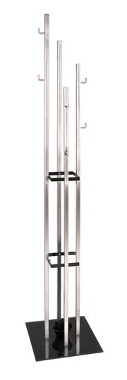 Ein Mix aus schwarzer Bodenplatte und Metall in Edelstahloptik verleiht dem Z2 Garderoben-Schirmständer "LEANDRO" ein trendiges Design. Damit ist er genau die richtige Ergänzung für den modernen Hausflur. Dank seiner kompakten Maße von B/H/T ca. 35 x 182 x 35 cm ist das Stück schmal genug, um auch in kleineren Fluren auf der quadratischen Grundplatte Ihre Schirme und Stöcke aufzunehmen. Acht Haken und eine Ablagefläche bieten weiter oben genug Platz für Jacken, Mäntel oder Schals. 9,2 kg Eigengewicht sorgen für die notwendige Standfestigkeit. Setzen Sie Akzente mit dem modernen Z2 Garderoben-Schirmständer "LEANDRO"!