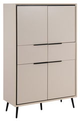 Das Z2 Highboard ARONA ist die perfekte Ergänzung für ein stilvolles, modernes Interieur. Mit seiner eleganten Sandfarbe und dem kontrastierenden schwarzen Korpusrahmen setzt es in jedem Raum einen trendbewussten Akzent. Das Highboard bietet mit vier Drehtüren und zwei Schubladen viel Stauraum und sorgt für Ordnung. Die grifflosen Türen und die praktische Griffleiste unterstreichen das minimalistische Design, während die stabile Konstruktion aus hochwertiger Holznachbildung und die Metallfüße Langlebigkeit garantieren. Die moderne Schrägkante an den Türen verleiht dem Möbelstück einen besonderen Charme, der Ihr Zuhause aufwertet.
