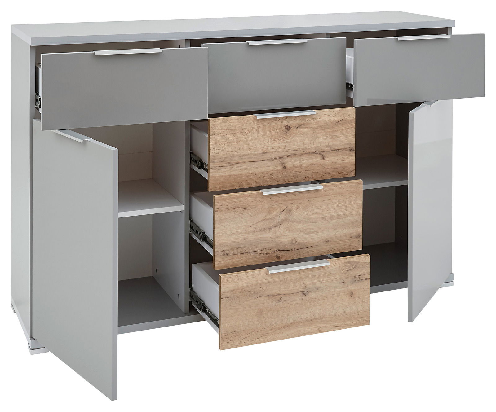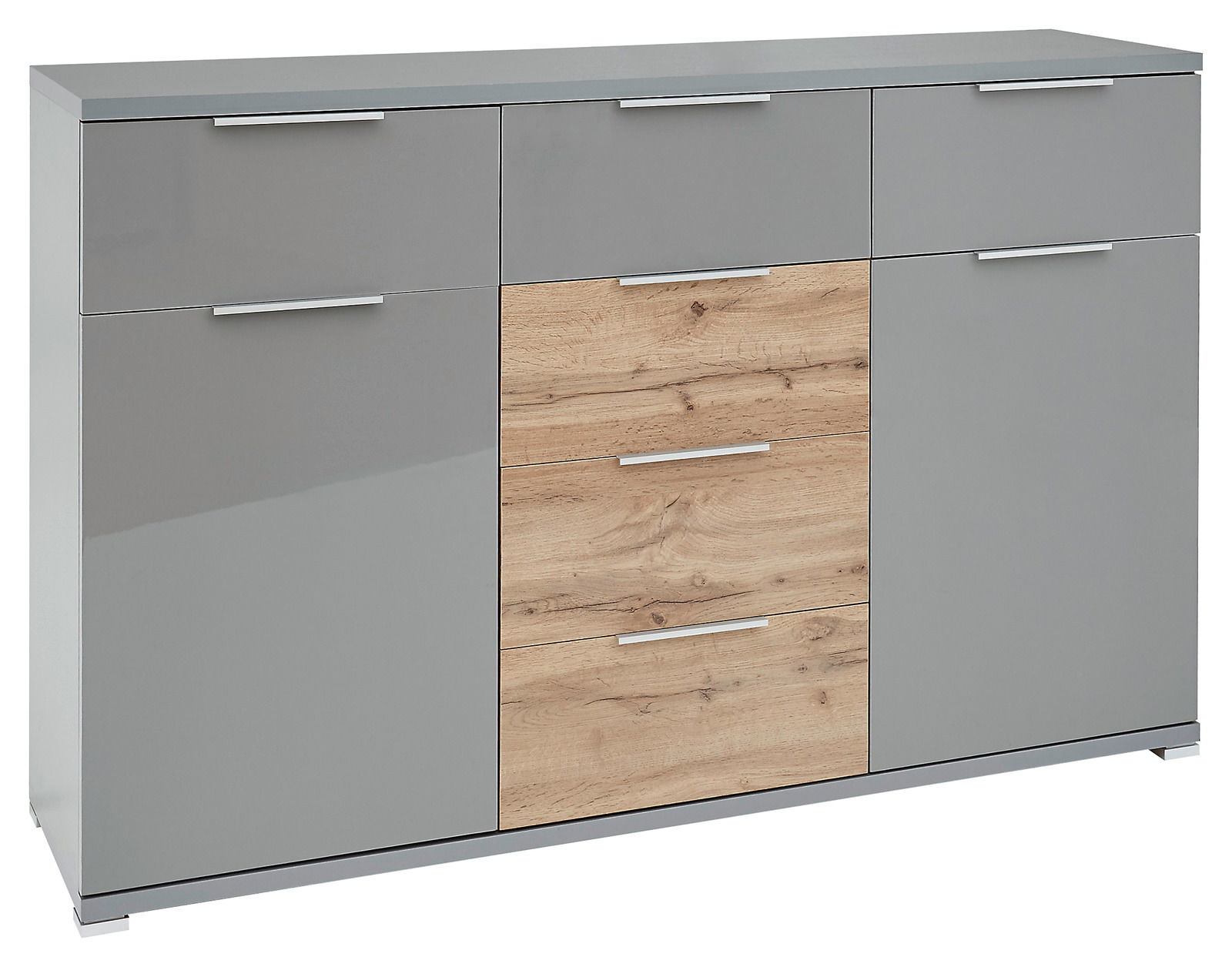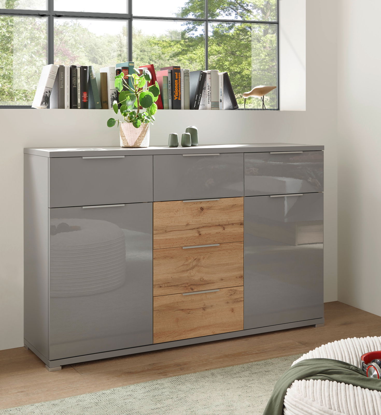 Die moderne Z2 Kommode "GIRONA" passt mit ihrem schlicht-eleganten Design zu verschiedenen Einrichtungsstilen. Die graue Front wird durch Absetzungen in Holzoptik aufgelockert.