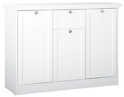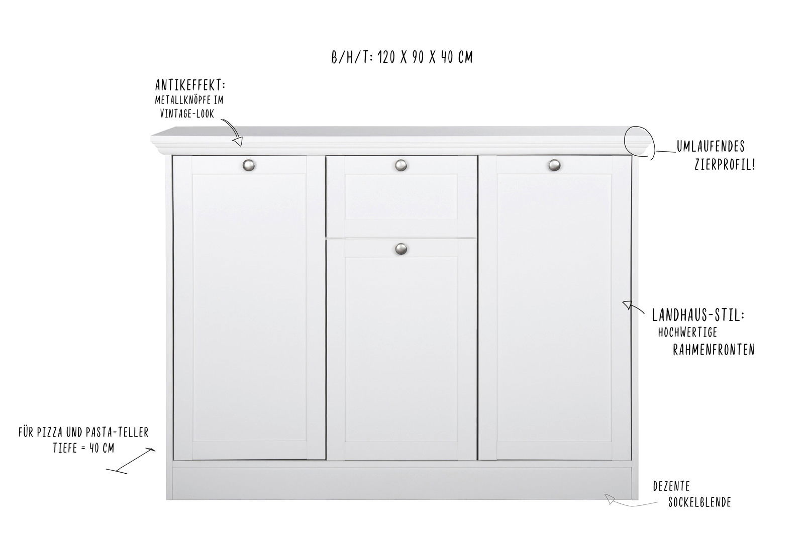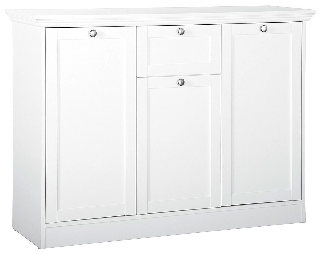 Die B/H/T ca. 120 x 90 x 40 cm große Kommode aus Holznachbildung und mit Metallknöpfen bietet in 1 Schublade und hinter 3 Türen viel Stauraum für Tischwäsche oder Kleidungsstücke. Das umlaufende Zierprofil sorgt bei der 26 kg schweren Kommode für ein verspieltes Element. Schaffen Sie sich schönen Stauraum mit der Z2 Kommode "LANDWOOD"!