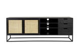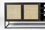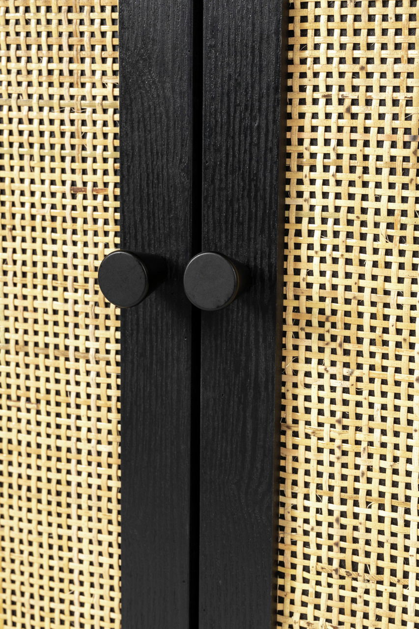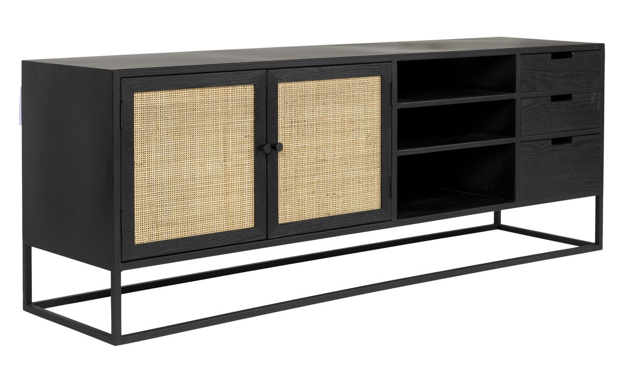 Mit dem Z2 Sideboard "GUUJI" erweitern Sie stilsicher das gleichnamige Möbelprogramm. Der schwarz lackierte, geradlinige MDF-Korpus ruht auf einem mattschwarzen Eisenrahmengestell. Naturfarbenes Rattangeflecht in den Türen verleihen dem Möbel dezenten Retro-Charme.