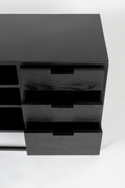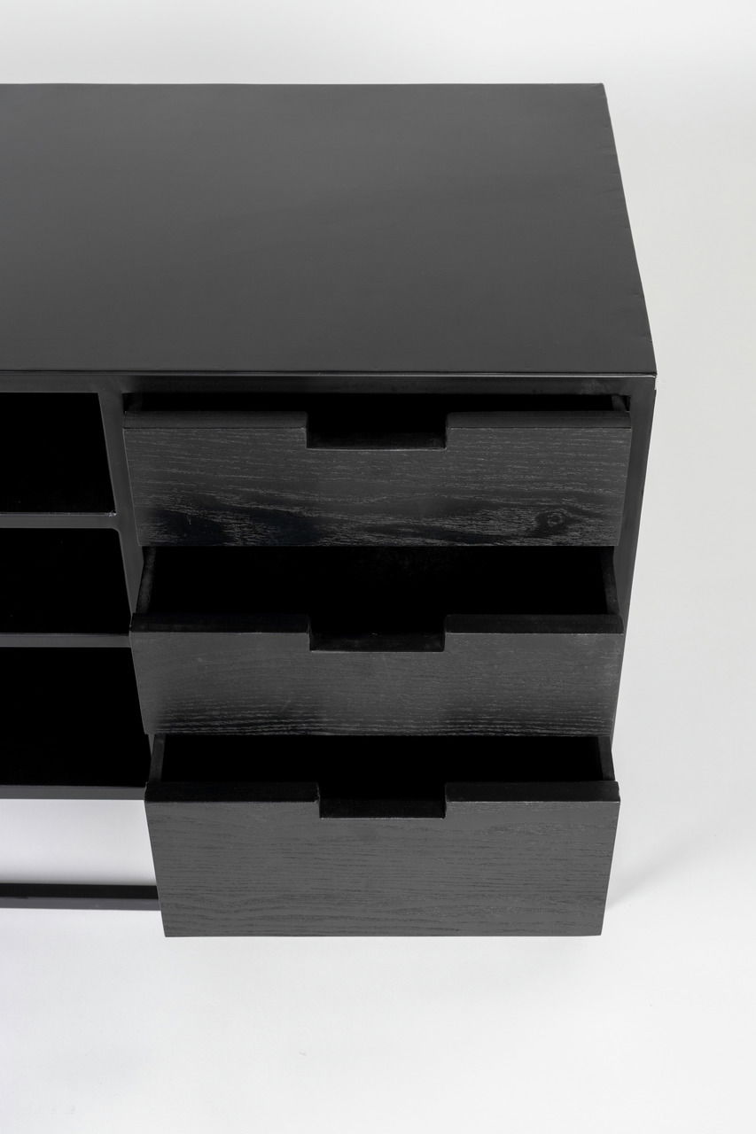 Stauraumfreundliches SideboardFür Wohn- oder Esszimmer ist das B/H/T ca. 150 x 55 x 38 cm große, 25 kg schwere Möbel ideal. Lackierte Oberflächen sowie pulverbeschichtete Metallbeine machen die hochwertige Holznachbildung reinigungsfreundlich. Hinter zwei Türen und in drei Schubladen verwahren Sie Bücher oder Geschirrteile, während Sie obenauf sowie in drei offenen Fächern Deko-Objekte deponieren. Wählen Sie das Z2 Sideboard "GUUJI"!