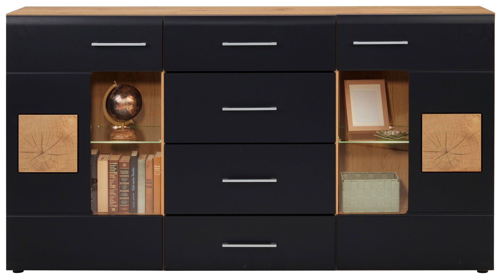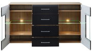 Großzügiges Sideboard mit GlaseinsatzVier Schubfächer mit Metallgriffen bieten viel Stauraum in dem B/H/T ca. 170 x 93 x 40 cm messenden Sideboard. Vier der acht Fächer hinter den beiden Drehtüren mit Glaseinsatz sind energiesparend beleuchtet. Kaufen Sie sich das Z2 Sideboard "SONATE"!