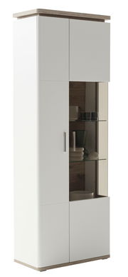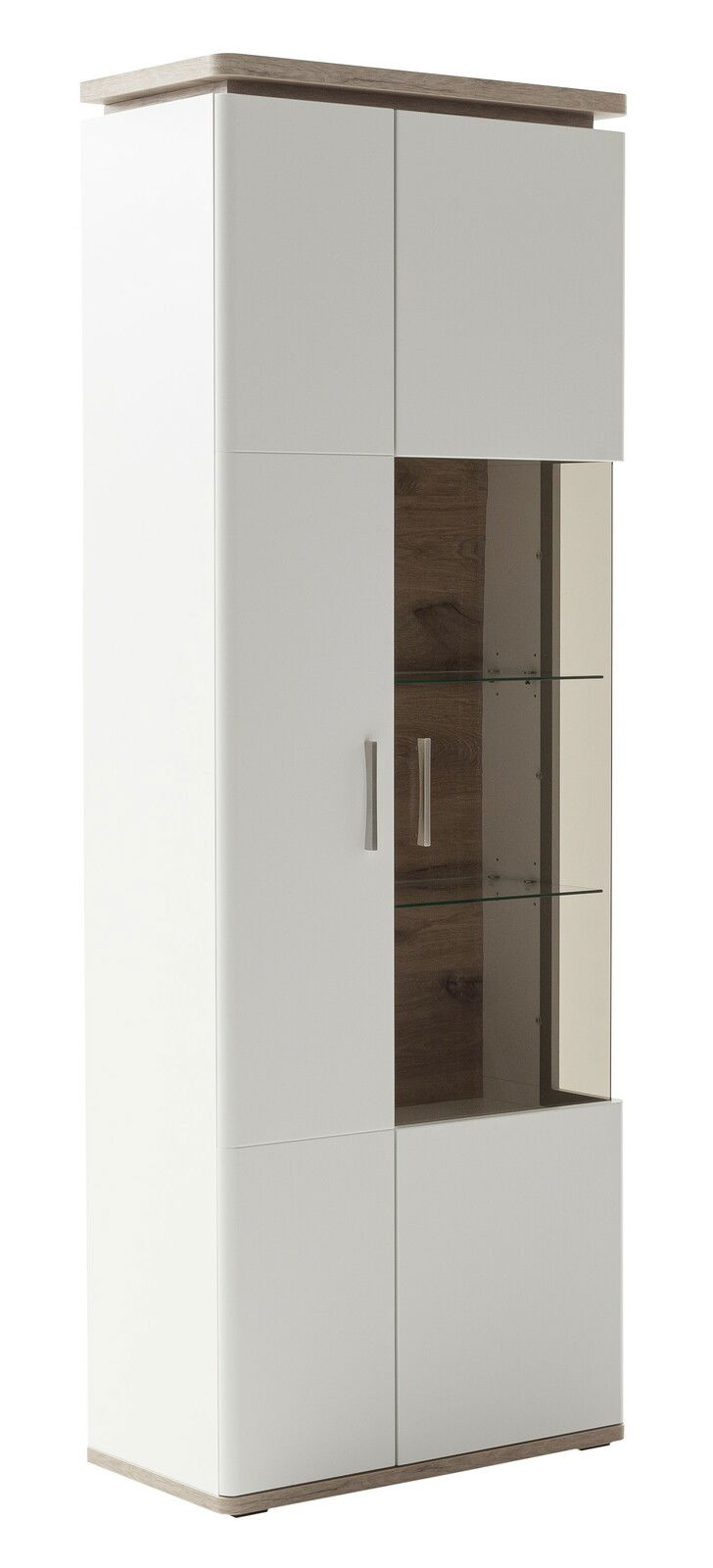 Die Zurbrüggen Kombi-Vitrine PALERMO besticht durch ihr modernes und trendiges Design, das mit seiner eleganten Farbgebung in Soft White sowohl im Front- als auch im Korpusbereich überzeugt. Die stilvolle Absetzung in Viking Oak Melamin setzt edle Akzente, während die matten Nickel-Griffe aus Metall für eine hochwertige Optik sorgen. Mit zwei Drehtüren ausgestattet, bietet diese Vitrine nicht nur ausreichend Stauraum, sondern auch eine integrierte LED-Beleuchtung im Oberboden, die Ihre Ausstellungsstücke ins rechte Licht rückt. Das Hauptmaterial aus Holznachbildung sorgt für eine robuste und langlebige Qualität.
