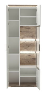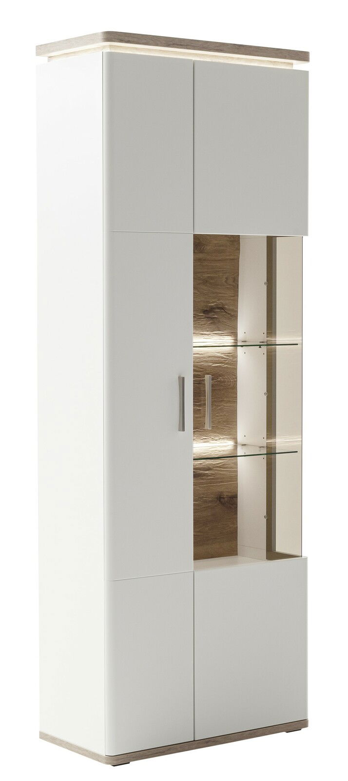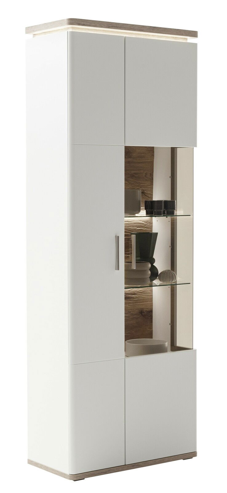 Die Zurbrüggen Kombi-Vitrine PALERMO bringt modernen Stil und trendiges Design in Ihr Zuhause. Mit ihrem eleganten weißen Erscheinungsbild, sowohl an der Front als auch am Korpus, fügt sie sich nahtlos in jede moderne Einrichtung ein. Die Absetzung aus Viking Oak Melamin verleiht dem Möbelstück eine besondere Note. Ausgestattet mit zwei Drehtüren, bietet die Vitrine reichlich Stauraum, während die dezente LED-Beleuchtung im Oberboden und an der Rückwand für eine stimmungsvolle Atmosphäre sorgt. Die Griffe aus matt gebürstetem Nickel setzen einen stilvollen Akzent. Diese Vitrine ist stehend und besteht aus hochwertiger Holznachbildung.