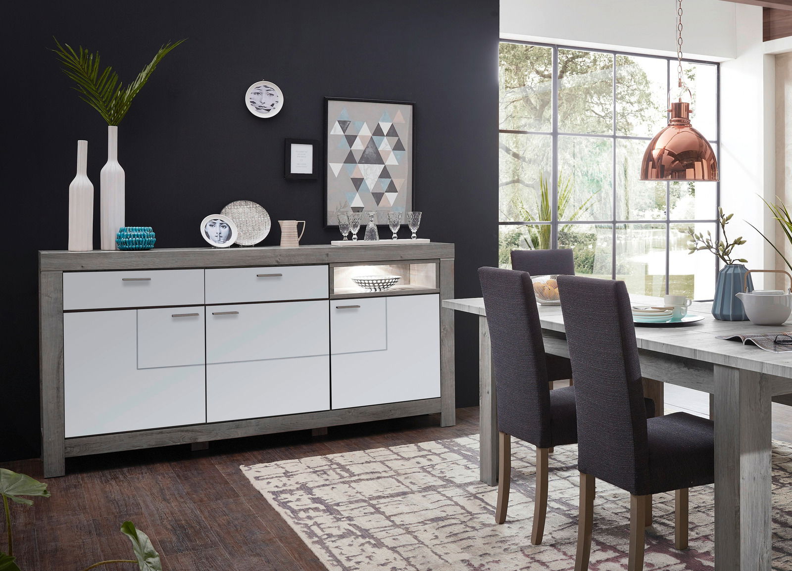 Sideboard mit SoftcloseIn mittelgroßen Raumbereichen ist das B/H/T ca. 196 x 100 x 42 cm große Möbel aus pflegeleichter MDF-Holznachbildung (Gewicht 103 kg) willkommen.Mattsilberne Griffstücke zieren drei Drehtüren sowie zwei Schubkästen. Im Inneren des Möbels verstauen Sie Wäsche, Hausrat oder Bücher. Das LED-beleuchtete Fachelement (Energieeffizienzklasse A) mit Klarglaseinsatz präsentiert Deko-Objekte. Bestellen Sie das ZURBRÜGGEN Sideboard "GRANADA"!