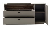 Das Sideboard LÜTTICH sorgt für bewundernde Blicke. Der Schubladenschrank erweitert mit seiner Drehtür Ihren Stauraum und ist mit seinen zwei Schubladen genau das richtige Möbelstück für alle, die Wert auf Ordnung legen. Alle Qualitäten und Highlights, die die Marke Zurbrüggen ausmachen, sind in dieser Kommode kombiniert. Ihr persönliches Einrichtungskonzept wird durch das moderne Design vervollständigt. Das Möbel aus Holz-Nachbildung ist grau. Das Modell LÜTTICH weist eine Breite von insgesamt 165 cm, eine Höhenabmessung von 84 cm sowie ein Tiefenmass von 44 cm auf. Das Gewicht beträgt im montierten Zustand 92 kg. Dieser Schubladenschrank verleiht Ihrem Zuhause eine behagliche Atmosphäre.