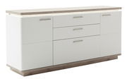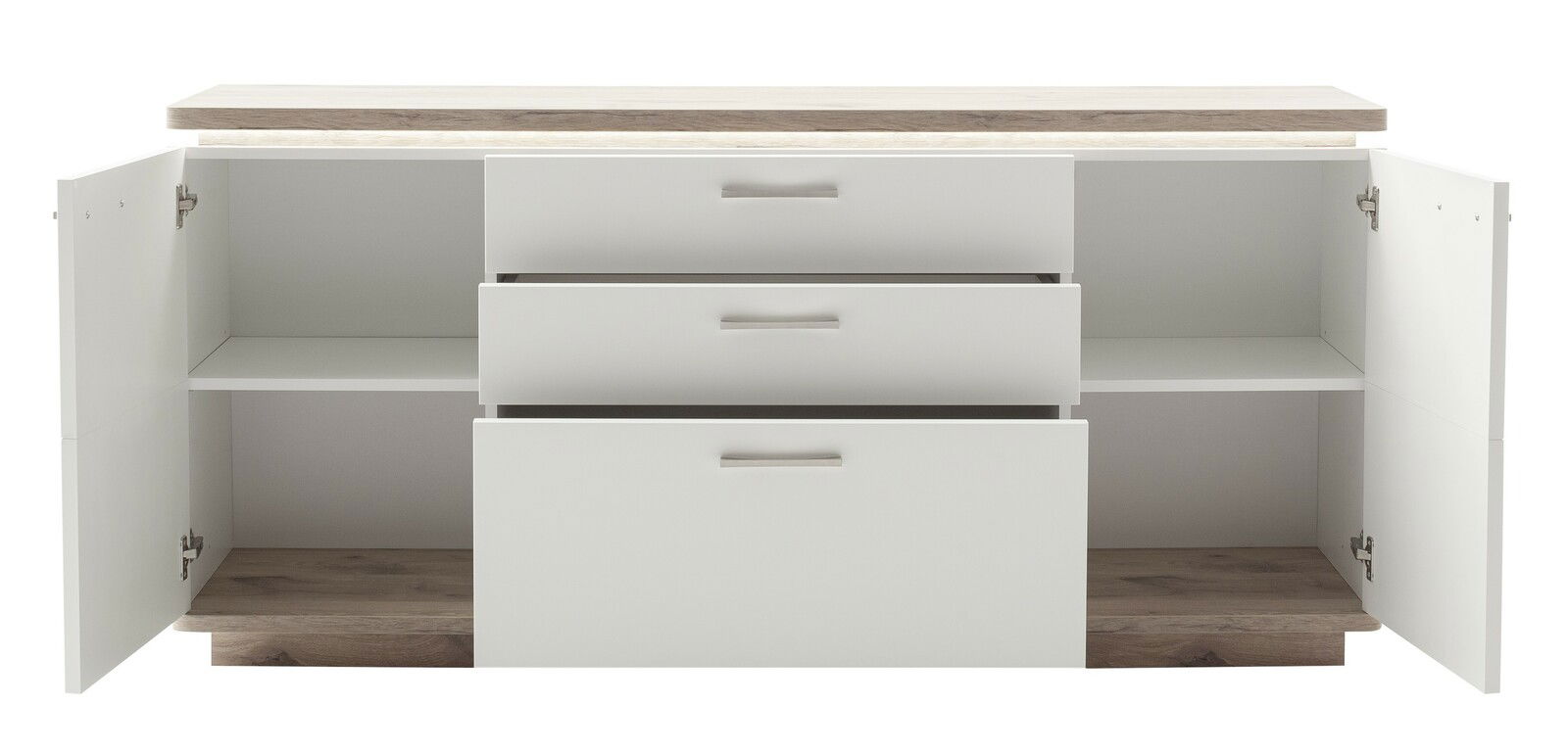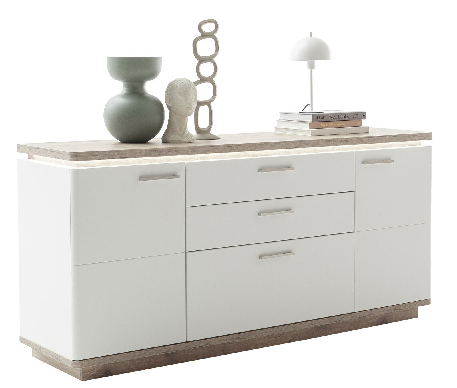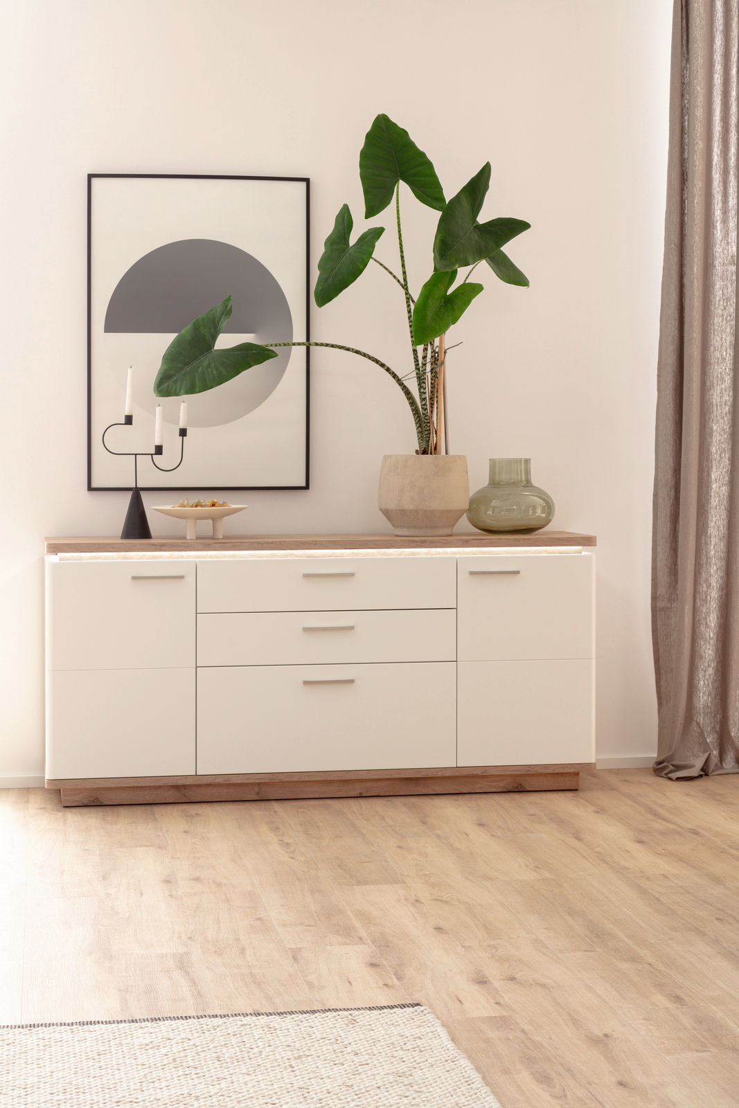 Das Zurbrüggen Sideboard PALERMO vereint modernes Design und Funktionalität in einem stilvollen Möbelstück. Die weiße Farbgebung in Kombination mit der Absetzung in Viking Oak Melamin sorgt für einen zeitgemäßen Look, der in jede Einrichtung passt. Die Fronten sind soft white tiefgezogen und der Korpus besteht aus soft white Melamin, was eine harmonische und elegante Optik bietet. Ausgestattet mit zwei Drehtüren und drei Schubladen bietet das Sideboard ausreichend Stauraum für Ihre Habseligkeiten. Die matt vernickelten Metallgriffe unterstreichen den modernen Stil, während die integrierte LED-Beleuchtung auf dem Oberboden einen besonderen Akzent setzt.