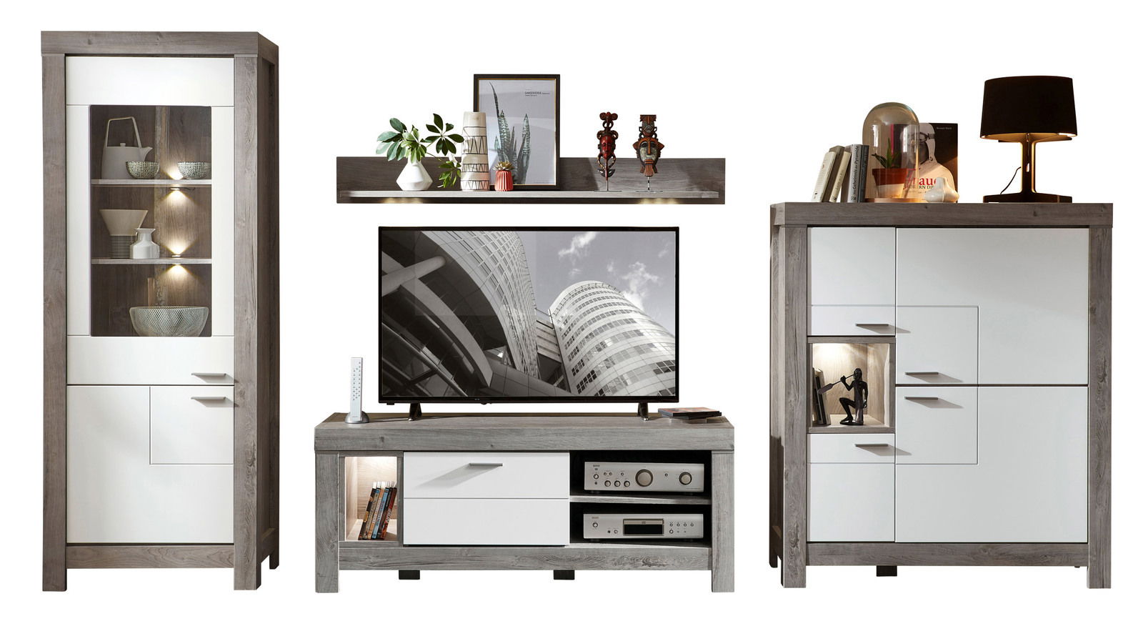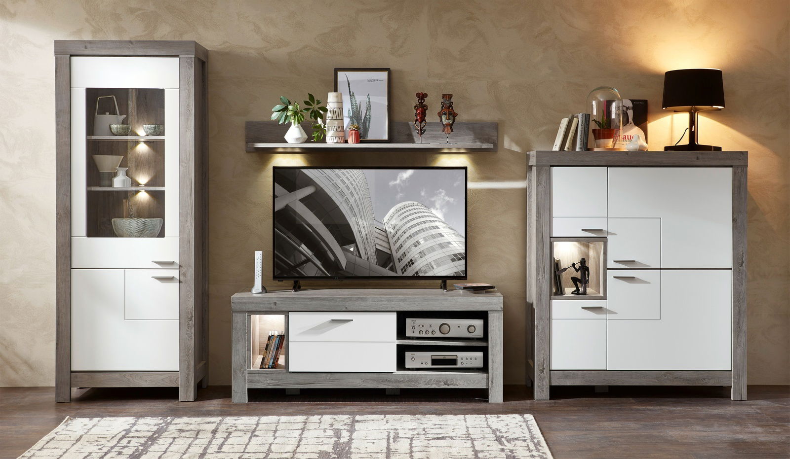 Mit der ZURBRÜGGEN Wandkombination "GRANADA" machen Sie Ihr modernes Einrichtungsambiente komplett. Die abgestimmten Module zeigen sind mit einem Korpus im Haveleiche-Dekor ausgestattet, der von Fronten in lackiertem Supermattweiß begleitet wird. Mattsilberne Griffstücke sowie Klarglaseinsätze sorgen für elegante Akzente.