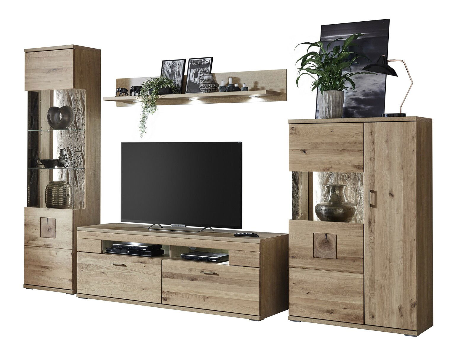 Die Wohnkombination KANSAS ist der perfekte Einrichtungsgegenstand zum Wohlfühlen. Das Möbelstück ergänzt Ihr persönliches Einrichtungskonzept durch sein natürliches Design. Es hat eine Breite von insgesamt 330 Zentimetern, ein Höhenmass von 208,3 Zentimetern und eine Tiefe von 50,2 Zentimetern. Sämtliche Qualitäten und Highlights der Marke Zurbrüggen kommen in dieser Wohnkombination zusammen. Das Modell KANSAS trägt mit seinen zwei Schubkästen dazu bei, Ihre vier Wände ordentlich zu halten, hat drei Drehtüren, hinter denen Sie Ihr Hab und Gut unterbringen können, und ist aus Eiche und Sicherheitsglas angefertigt. Diese Wohnwand schafft im jedem Zuhause eine gemütliche Atmosphäre.