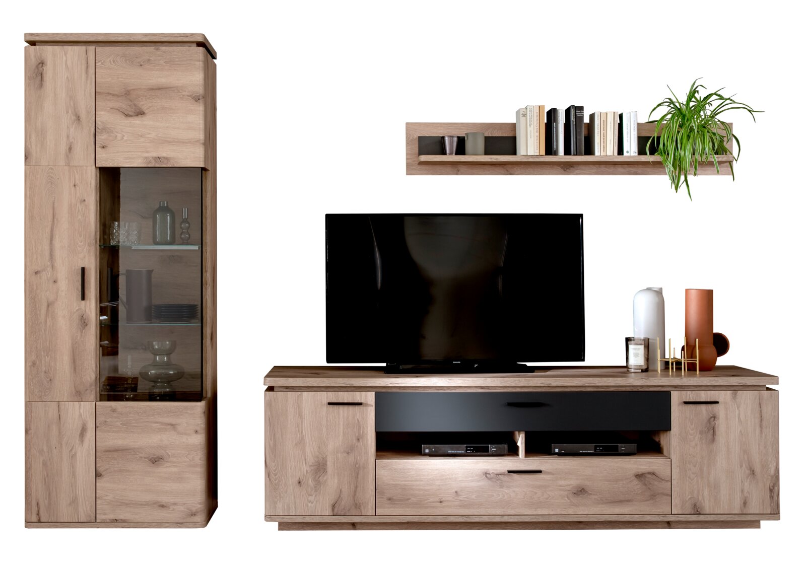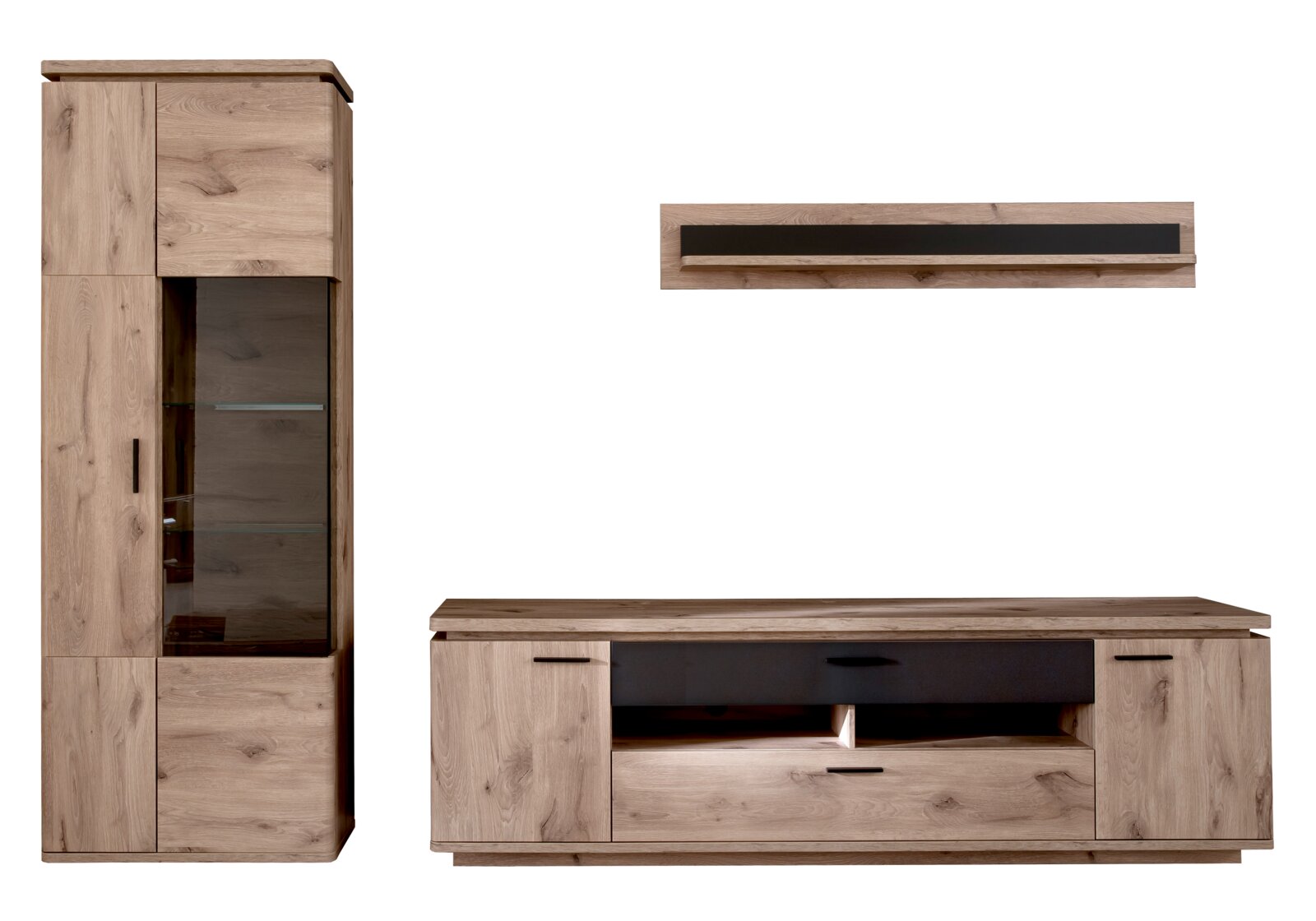 Mit dieser Wohnkombination holen Sie sich ein Stück Wohlbefinden in Ihr Zuhause. Das natürliche Design harmoniert perfekt mit nahezu jedem Einrichtungskonzept. Das Modell MODENA hat eine Breite von 295 cm, eine Höhe von insgesamt 208 cm und eine Tiefe von 50 cm. Gut durchdachtes Design und ein überzeugendes Wohnerlebnis prägen die Wohnwand der Marke Zurbrüggen. Zum Möbelstück MODENA gehört eine Ablagefläche als integriertes Extra dazu. Holz-Nachbildung wurde in dieser Wohnwand verarbeitet. Zudem glänzt die Wohnwand mit zwei Schubkästen, mit denen Sie im Handumdrehen Ordnung in Ihr Zuhause bringen, und hat vier Drehtüren mit Stauraum zum Unterbringen verschiedenster Gegenstände dahinter. Ihr Wohnzimmer ist mit dieser Wohnwand ideal ausgestattet.
