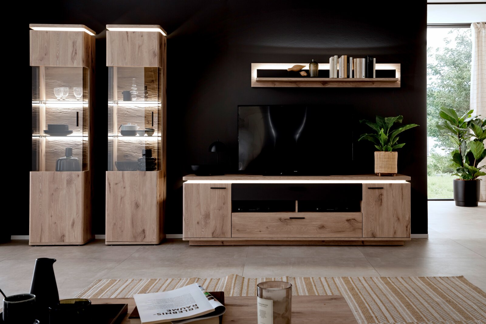Ein besonderes Highlight dieser Wandkombination ist die integrierte LED-Beleuchtung. Im Oberboden, an der Rückwand und als LED-Bandbeleuchtung setzt sie Ihre Wohnaccessoires stilvoll in Szene. Die klaren Glasböden aus Sicherheitsglas bieten eine sichere und attraktive Ablagefläche. Mit der Drehtür der Vitrinen und den Schubkästen haben Sie stets alles ordentlich verstaut. Erleben Sie eine neue Dimension der Wohnraumgestaltung und bringen Sie mit der Zurbrüggen Wandkombination MODENA Eleganz und Funktionalität in Ihr Zuhause. Bestellen Sie jetzt und verleihen Sie Ihrem Wohnbereich frischen Glanz.