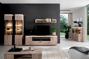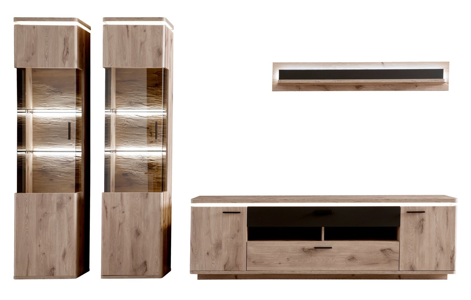 Die Zurbrüggen Wandkombination MODENA vereint Funktionalität und stilvolles Design. Gefertigt aus hochwertiger Eichenachbildung, präsentiert sich diese Kombination in einer eleganten Viking oak tiefzieh Nachbildung für die Front und einer Viking oak Melamin Nachbildung für den Korpus. Die braune Farbgebung unterstreicht den natürlichen und massiven Stil. Die klare Linienführung und die anthrazitfarbenen Griffe sorgen für einen modernen Touch. Diese Wandkombination besteht aus zwei Vitrinen, einem TV-Lowboard und einem Wandboard und bietet somit ausreichend Stauraum für Ihr Wohnzimmer.