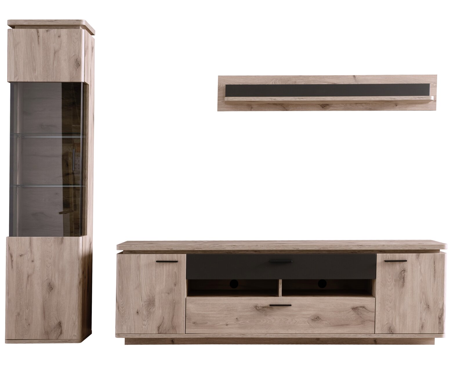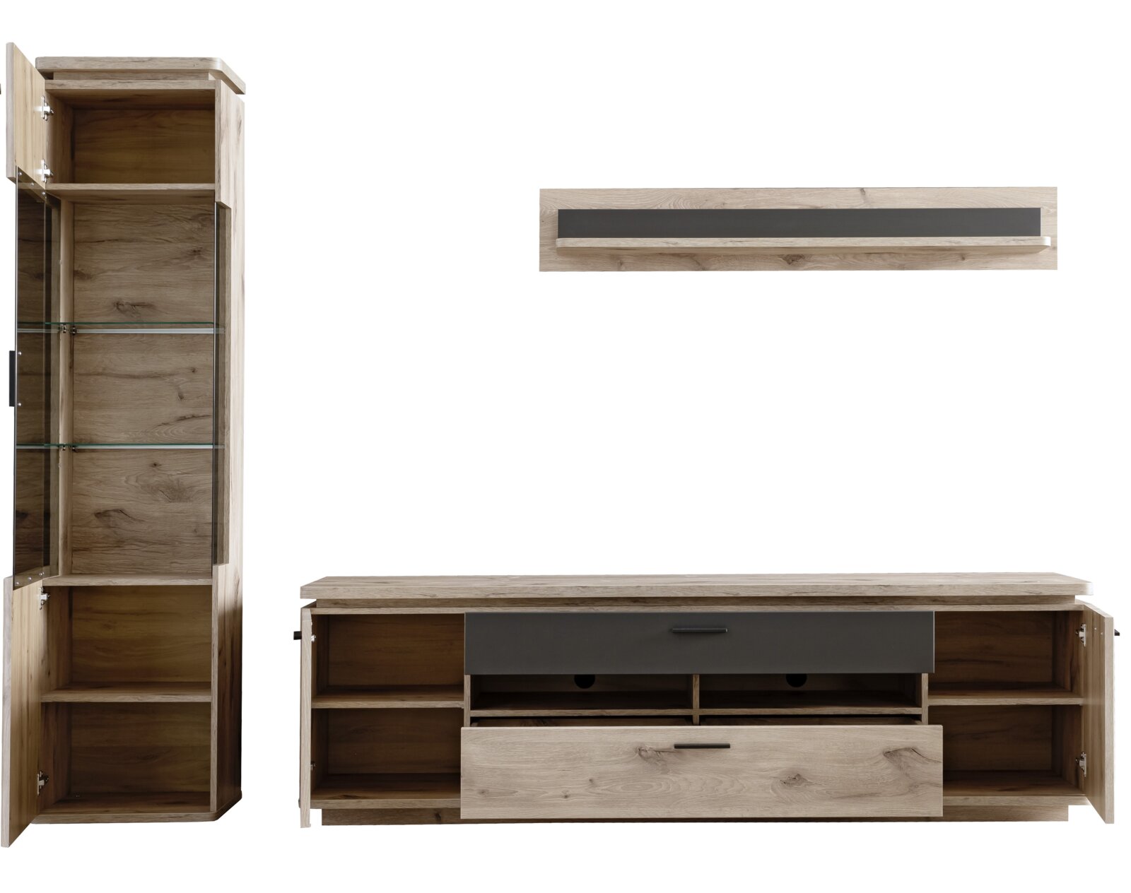 Wandkombination MODENA - Funktion trifft auf Stil Erleben Sie die perfekte Symbiose aus Funktionalität und Ästhetik mit der Wandkombination MODENA. Die Drehtüren und Griffe sind funktional gestaltet, um Ihnen komfortablen Zugriff zu bieten, während das anthrazitfarbene Absetzungsdesign einen modernen Akzent setzt. Die Kombination aus Sicherheitsglas und massiven Holznachbildungen sorgt für Langlebigkeit und Stabilität. Verleihen Sie Ihrem Zuhause mit der Zurbrüggen Wandkombination MODENA eine stilvolle Note und schaffen Sie eine einladende Atmosphäre. Entdecken Sie die Vielseitigkeit und Qualität dieses Möbelstücks und gestalten Sie Ihren Wohnraum neu.