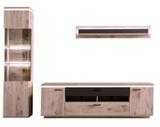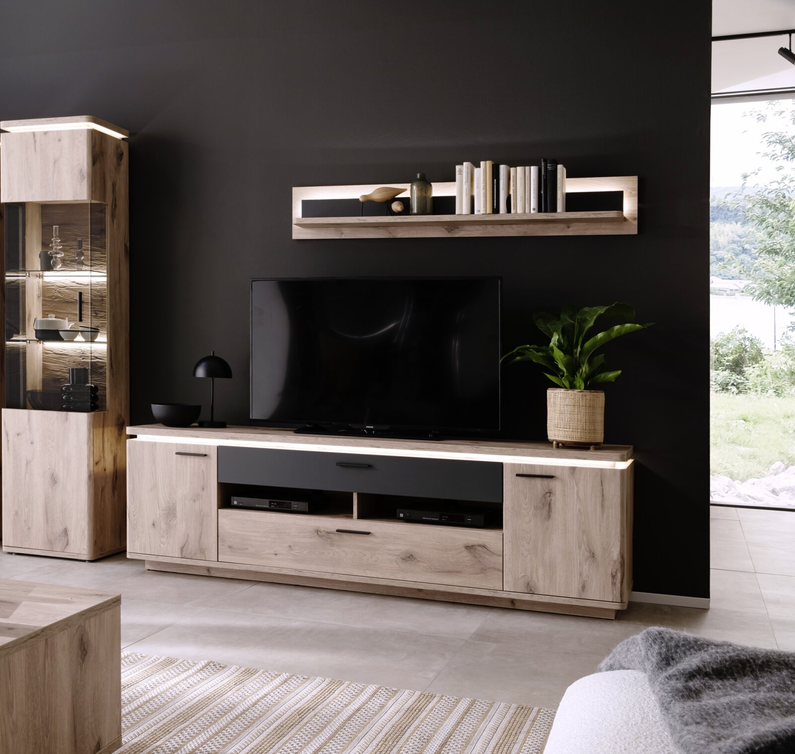 Wandkombination MODENA – Beleuchtung inklusive Diese Wandkombination bietet mehr als nur Stauraum: Mit der integrierten LED-Beleuchtung im Oberboden und der LED-Rückwandbeleuchtung wird Ihr Wohnzimmer in ein gemütliches Ambiente getaucht. Die Beleuchtung hebt die Schönheit der Eichen-Nachbildung und der Glasflächen hervor und sorgt für eine stimmungsvolle Atmosphäre. Die Drehtüren bieten einfachen Zugang zum Innenraum und sind ideal für die stilvolle Präsentation Ihrer Lieblingsstücke. Entscheiden Sie sich für die Zurbrüggen Wandkombination MODENA und verleihen Sie Ihrem Wohnraum einen Hauch von natürlicher Eleganz. Bestellen Sie noch heute und erleben Sie das Zusammenspiel von Design und Funktionalität!