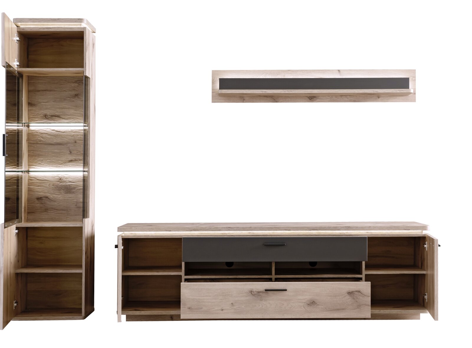 Die Zurbrüggen Wandkombination MODENA vereint natürliche Eleganz mit moderner Funktionalität. In einem warmen Eichenfarbton gehalten, harmoniert die Kombination aus Vitrine, Wandboard und TV-Lowboard perfekt mit jedem Wohnstil. Die Fronten in Viking Oak tiefzieh Nachbildung und der Korpus in Viking Oak Melamin Nachbildung strahlen zeitlose Schönheit aus. Hochwertiges Sicherheitsglas sorgt für eine robuste und langlebige Oberfläche. Die anthrazitfarbenen Absetzungen setzen stilvolle Akzente, während die Griffdetails das Design abrunden. Die Kombination aus klaren Glasböden und grauem Parsolglas verleiht dem Möbelstück eine moderne Note. Die perfekte Wahl für Liebhaber natürlicher Ästhetik.