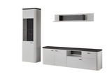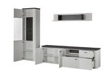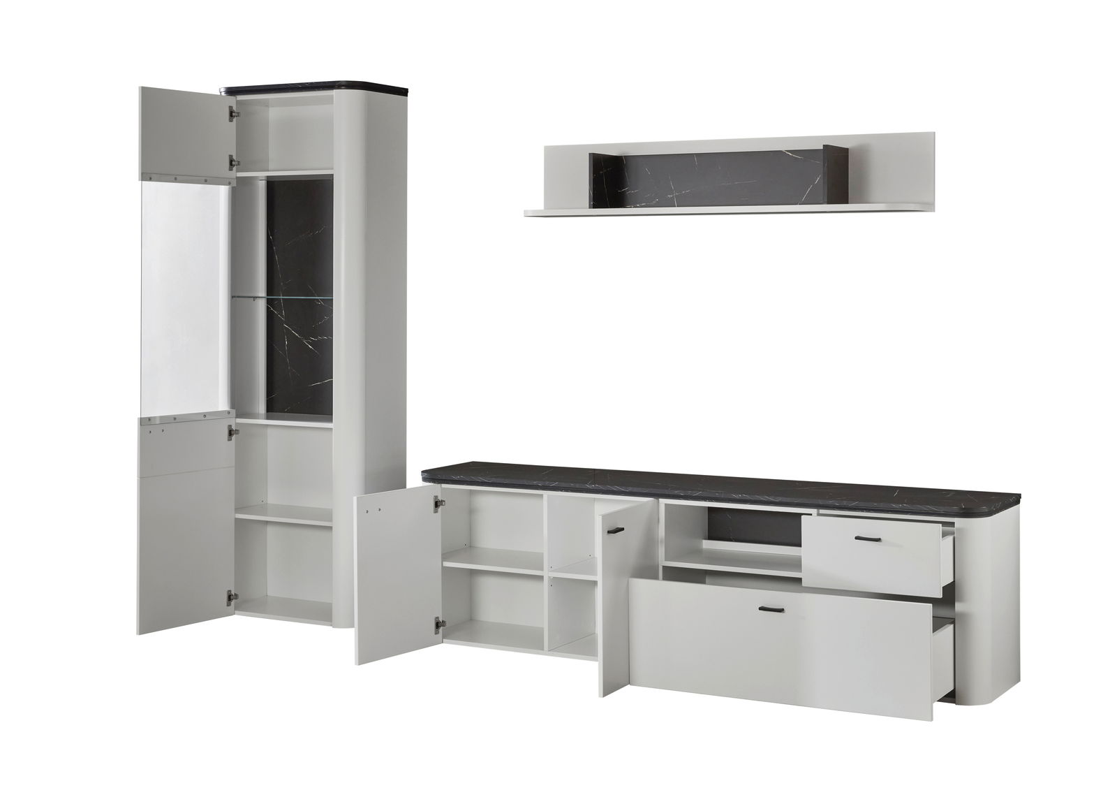 Die Zurbrüggen Wandkombination WAVE ist die perfekte Ergänzung für ein modernes Wohnambiente. Gefertigt aus hochwertiger Holznachbildung in edlem Weiß, bringt sie Eleganz und Funktionalität in jeden Raum. Die Kombination umfasst eine Vitrine, ein TV-Unterteil und ein Wandboard, die durch ihre klare Linienführung und das zeitgemäße Design bestechen. Die schwarzen Griffe setzen stilvolle Akzente und die Drehtüren, bestehend aus einer Glastür und zwei Holztüren, bieten praktischen Stauraum. Mit sechs Böden, davon einer aus Glas, lässt sich Ihre Wohnfläche optimal organisieren und präsentieren, auch wenn keine Beleuchtung integriert ist.