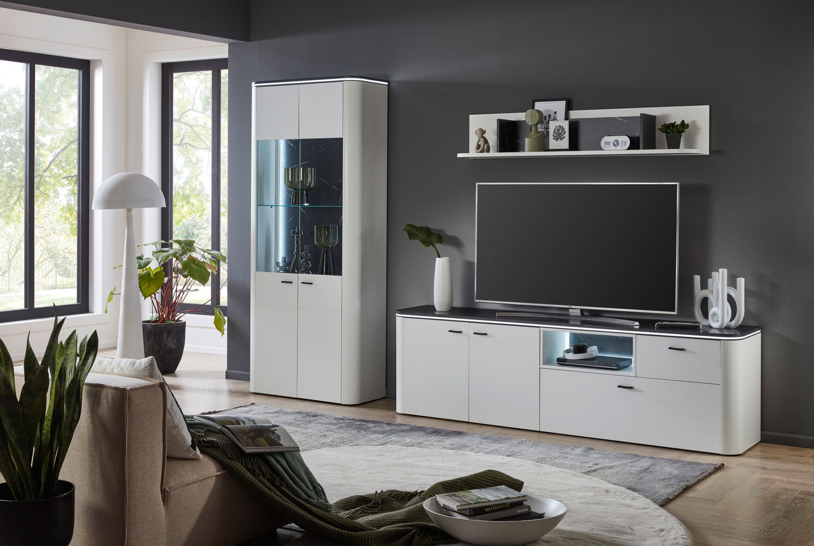 Wandkombination WAVE: Elegantes Design mit Beleuchtung Entdecken Sie die Vielseitigkeit der Zurbrüggen Wandkombination WAVE. Dank der drehtürigen Vitrine, dem TV-Unterteil und dem Wandboard bietet sie eine durchdachte Aufteilung für all Ihre Wohnbedürfnisse. Die Oberbodenbeleuchtung und die zwei 2er LED-Streifen verleihen Ihrem Raum eine angenehme Atmosphäre und setzen Ihre Lieblingsstücke stilvoll in Szene. Ein Glasboden und acht weitere Böden bieten zusätzliche Flexibilität in der Gestaltung. Erleben Sie, wie dieses Möbelstück Ihr Zuhause verwandeln kann. Bestellen Sie jetzt und genießen Sie stilvolle Funktionalität!