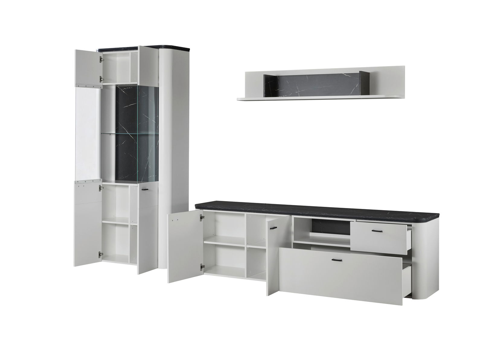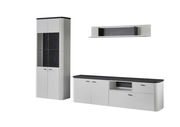 Die Zurbrüggen Wandkombination WAVE vereint modernes Design und funktionale Eleganz in einem atemberaubenden Möbelstück. Die Kombination aus Weiß und klaren Glaselementen bringt eine zeitlose Ästhetik in Ihr Wohnzimmer. Diese Wandkombination bietet nicht nur Platz für Ihren Fernseher, sondern auch für dekorative Objekte und Bücher. Das hochwertige Material in Holznachbildung sorgt für Langlebigkeit und eine hochwertige Optik. Mit vier Türen, darunter zwei Glastüren und zwei Holztüren, sowie zwei Schubladen, bietet sie reichlich Stauraum. Der moderne Look wird durch schwarze Griffe und integrierte LED-Beleuchtungselemente abgerundet.
