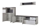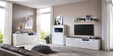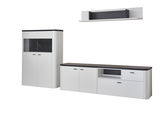 Erleben Sie die stilvolle Zurbrüggen Wandkombination WAVE, die modernes Design und Funktionalität perfekt vereint. Diese elegante Kombination in strahlendem Weiß besteht aus einem Highboard, einem TV-Unterteil, einem Wandboard und einer Oberbodenbeleuchtung. Mit der integrierten LED-Streifenbeleuchtung setzen Sie Ihre Wohnräume perfekt in Szene. Die Kombination aus Klarglas und hochwertigen Holznachbildungen verleiht diesem Möbelstück einen modernen Look. Ausgestattet mit schwarzen Griffen, zwei Glastüren, zwei Holztüren und sechs Fachböden, bietet sie viel Platz für Ihre persönlichen Gegenstände. Zwei praktische Schubladen runden das Gesamtbild ab und sorgen für zusätzlichen Stauraum.