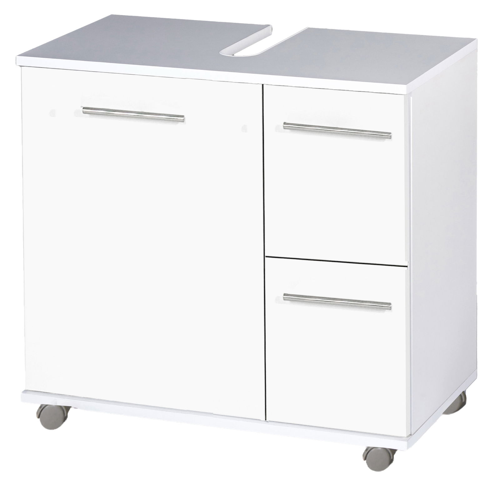 Kleiner WaschbeckenunterschrankDas kompakte B/H/T ca. 65 x 60 x 32 cm große Badmöbel mit praktischem Siphonausschnitt integriert sich hervorragend für kleinere Bäder. Eine Tür und zwei Schubkästen mit Griffen bieten Ihnen Stauraum für beispielweise Handtücher. Auf Rollen stehend lässt sich das Modell auch leicht verschieben, um z. B. unter dem Waschbecken zu putzen. Die Bauweise in Holznachbildung ist leicht (16,4 kg) und widerstandsfähig. Nehmen Sie den ZURBRÜGGEN Waschbeckenunterschrank "EMMI"!