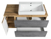 Das XORA Waschtisch-Set VARESE beeindruckt mit einem modernen und trendbewussten Design. Die Kombination aus betonfarbener Front und Korpus in Eiche Wotan sorgt für einen stilvollen Look, der sich perfekt in jedes Badezimmer einfügt. Das hängende Waschtisch-Set ist nicht nur optisch ansprechend, sondern auch praktisch. Mit einer Tür und zwei Schubladen bietet es genügend Stauraum für Ihre Badutensilien. Dank der grifflosen Optik und der hochwertigen Holznachbildung als Hauptmaterial strahlt das Set eine zeitlose Eleganz aus. Die Softclose-Funktion sorgt zudem für ein geräuschloses und sanftes Schliessen von Türen und Schubladen.